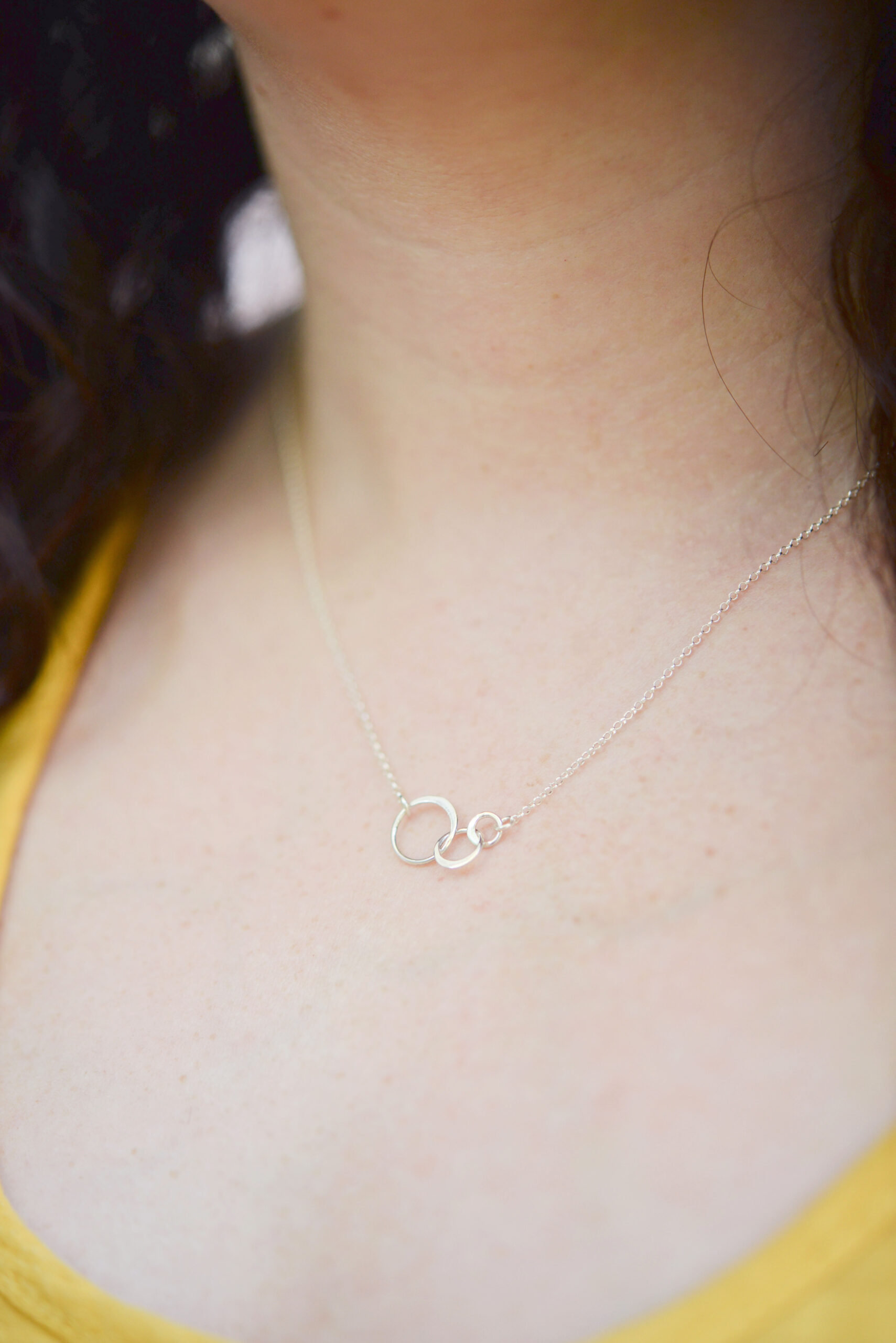 This simple necklace represents the ties between generations. The three sterling silver rings are intertwined, as the lives of family generations. The rings measure approximately 1 inch across. Presented on a Generations card that reads, “What greater thing is there for human souls, than to feel that they are joined for life to be with each other in silent unspeakable memories. –George Elliot” Also available in sterling and gold.